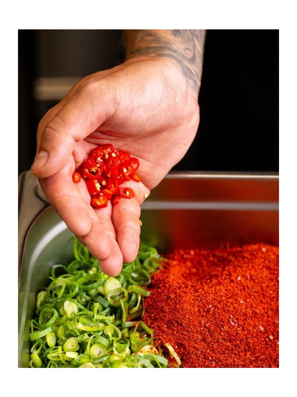 Základ tvoří sušené chilli papričky, kvalitní sojová omáčka, jarní cibulka a sezam...