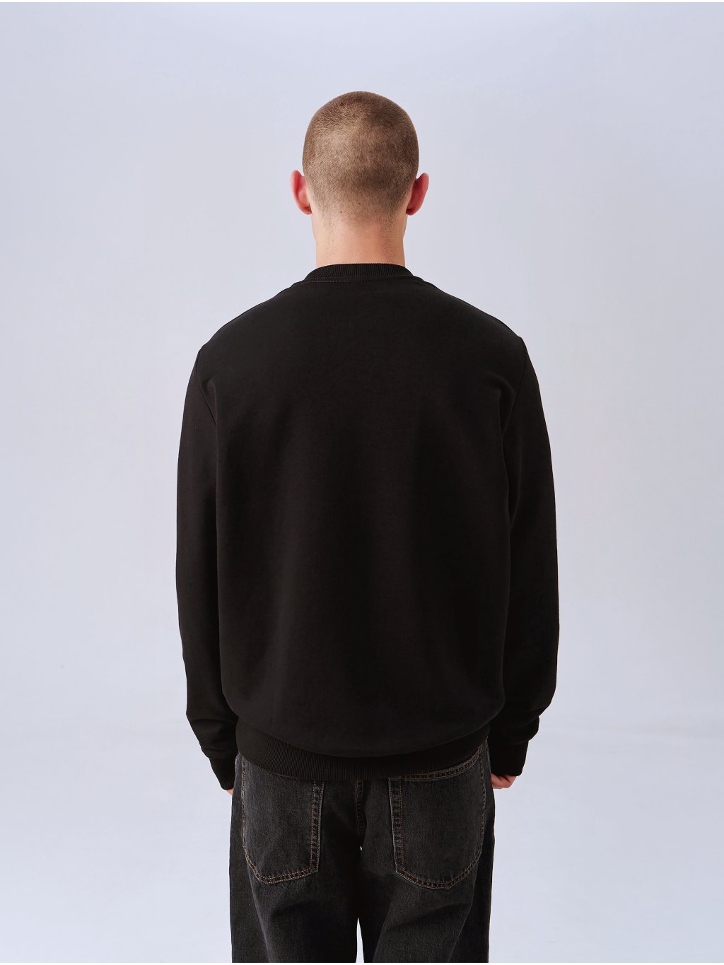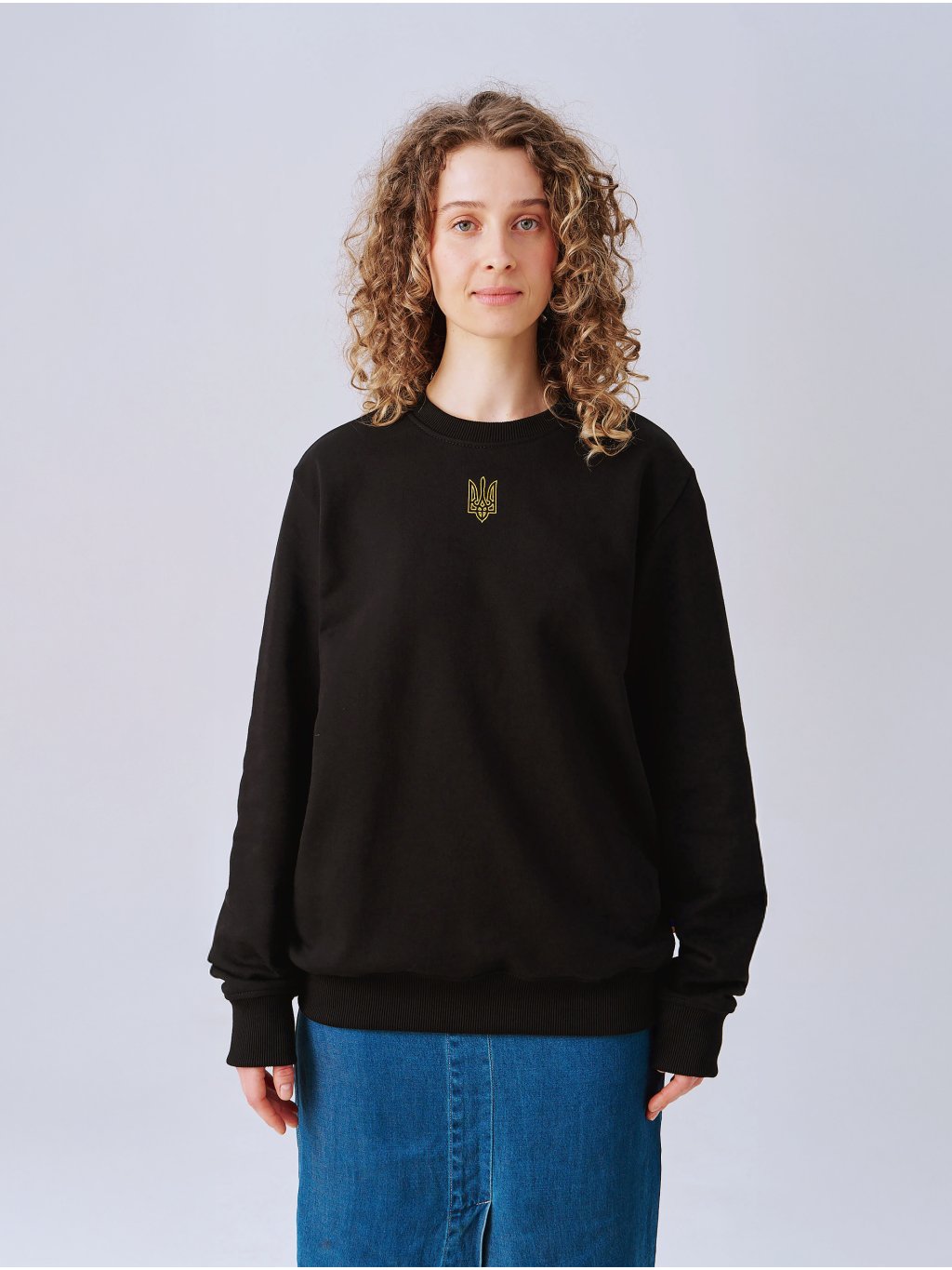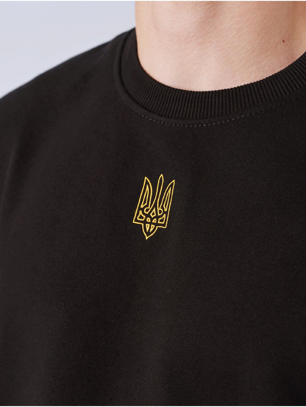 Black crewneck sweatshirt Saint Javelin with embroidery of the Ukrainian state emblem. Unofficial uniform of President Volodymyr Zelensky. Made in Ukraine.