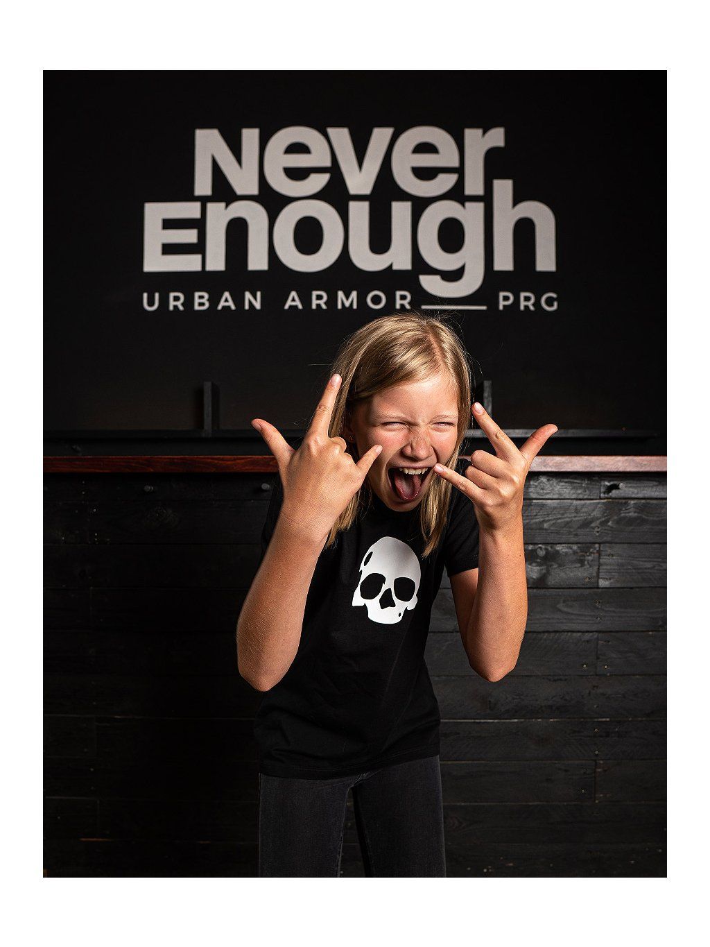 Children's black T-shirt made of high quality organic cotton with white NeverEnough logo. Immortal medium weight material. With our logo, your child will please more than one teacher at the institute. Only for well-behaved boys and girls.