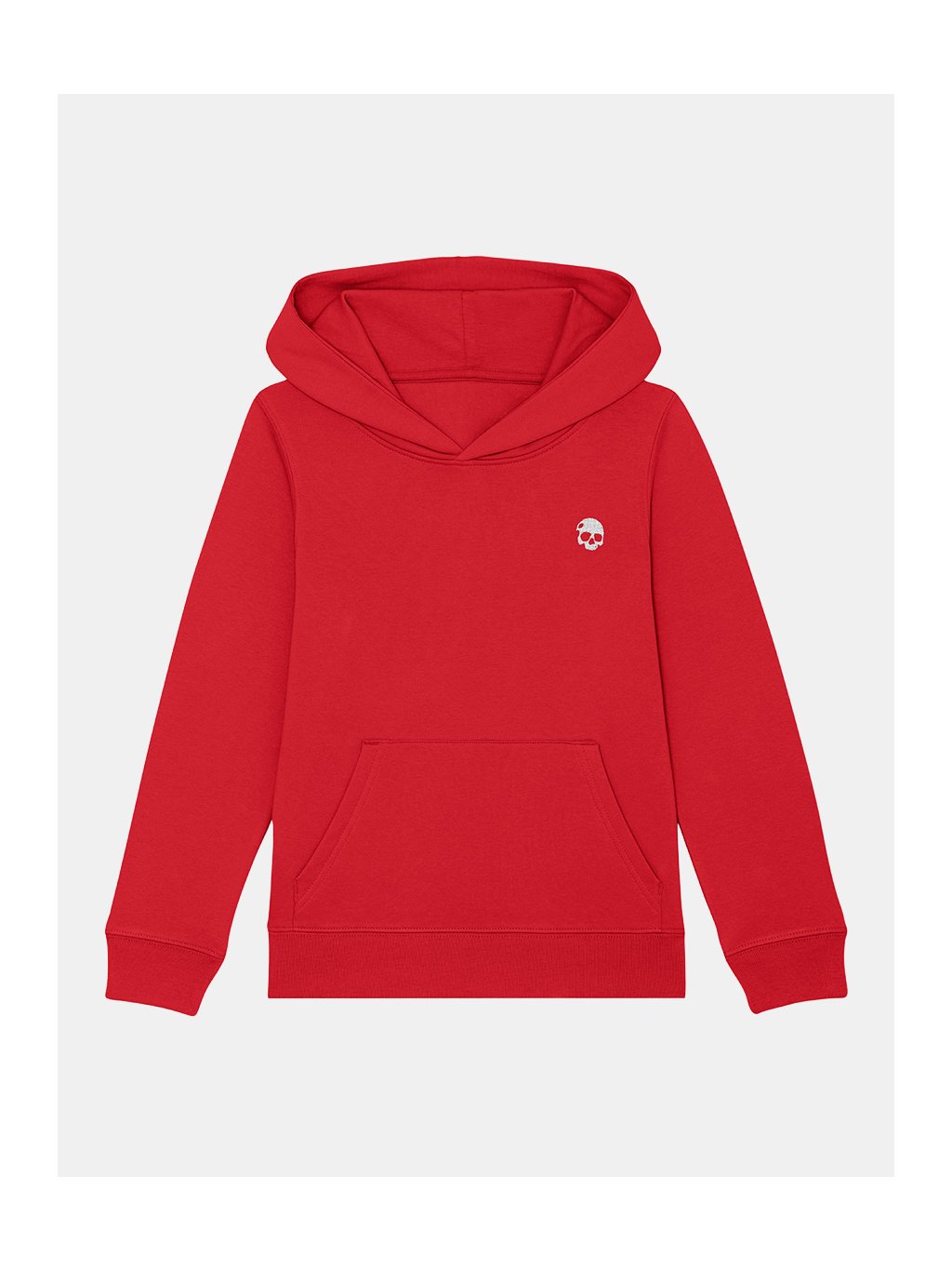 Children's red hoodie made of high quality organic cotton with white embroidered NeverEnough logo.