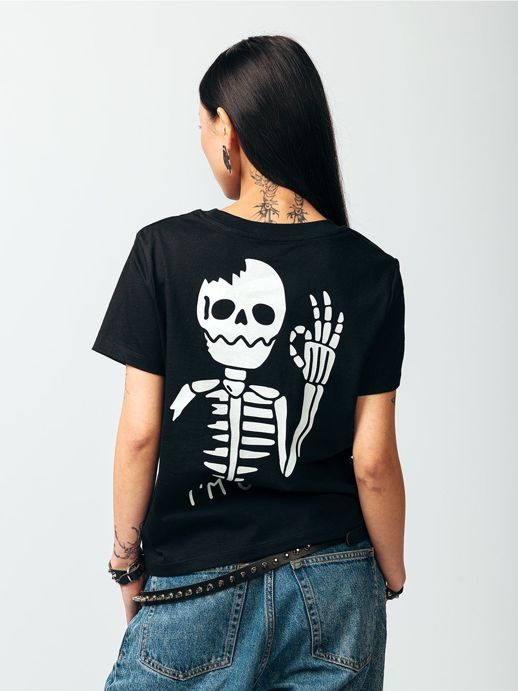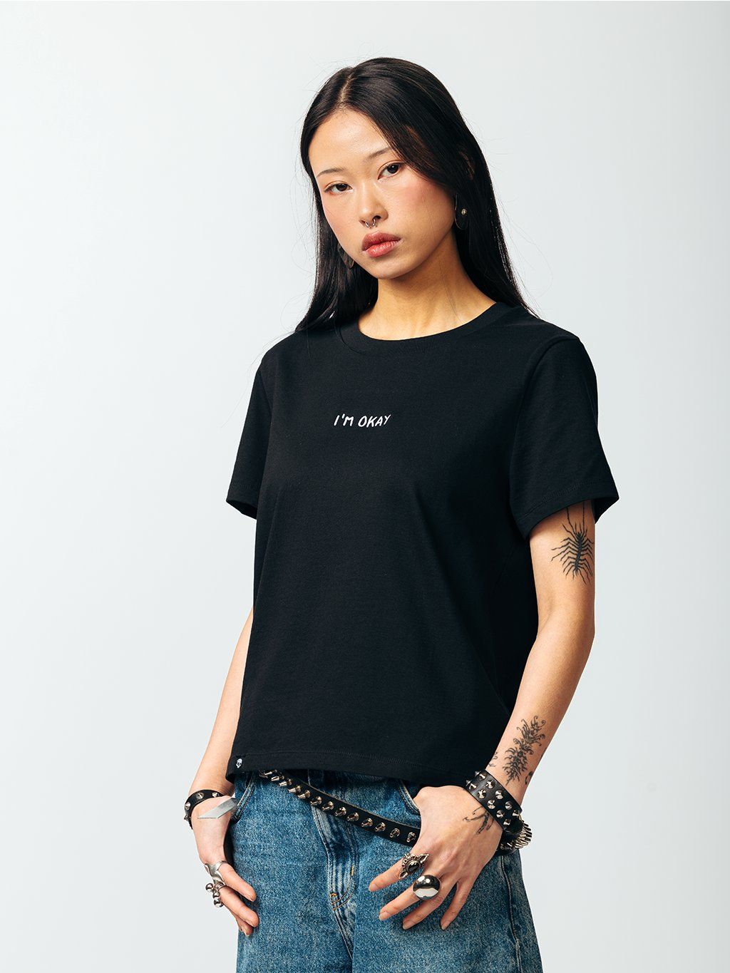 The I'm OKAY claim is embroidered on the chest. The main illustration is screen printed.