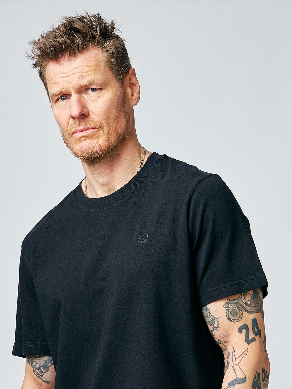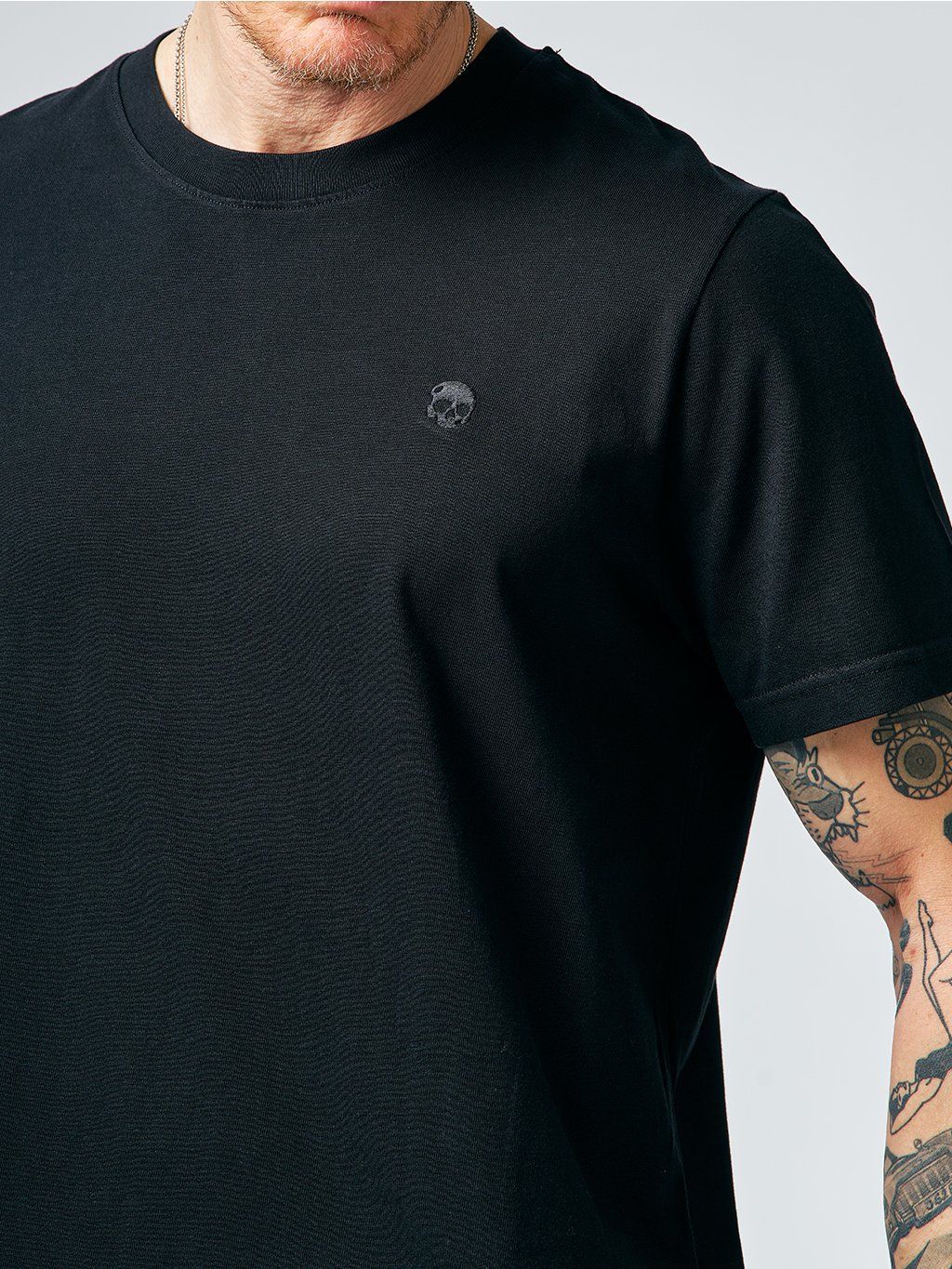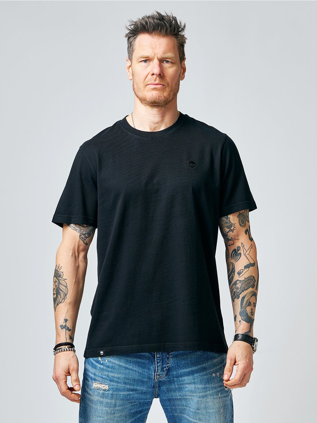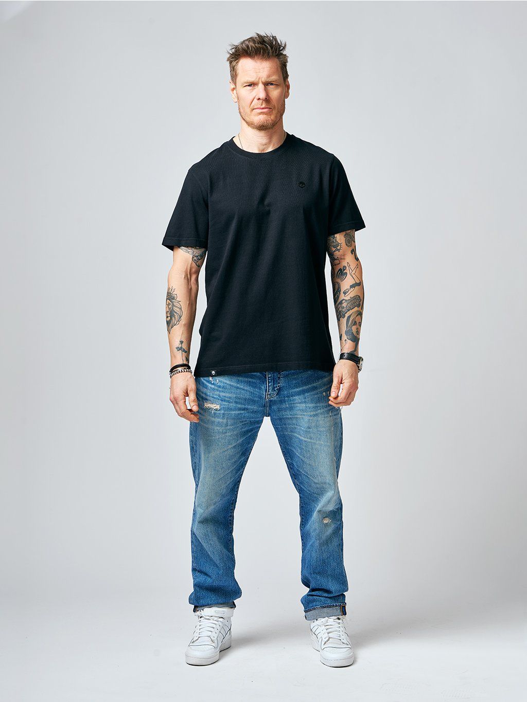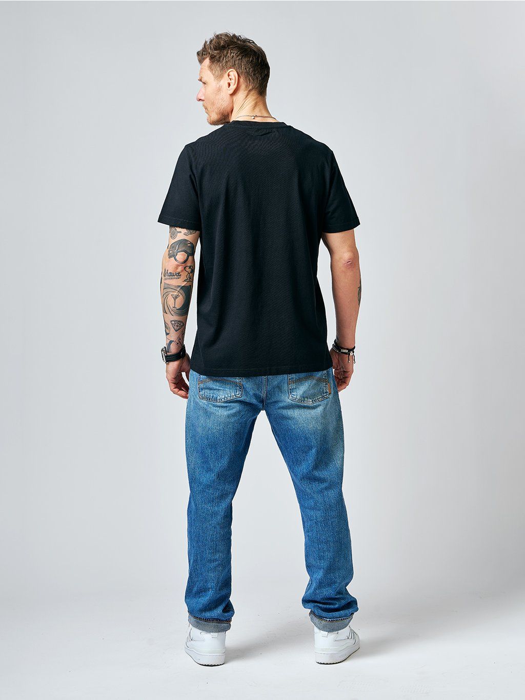 If you're bored with the selection of black t-shirts, we have news for connoisseurs. Relaxed fit - a slightly oversized, but still perfectly cut T-shirt made of high grammage cotton. Slightly extended sleeves that can be shortened at will thanks to the fixed hem with a stylish roll-up.