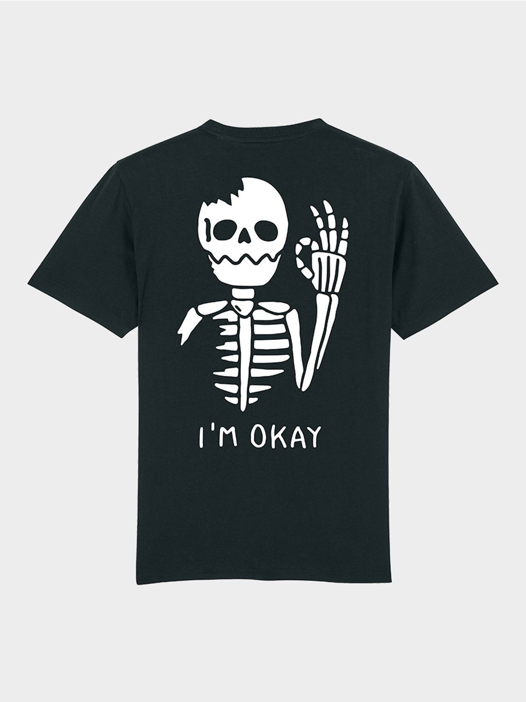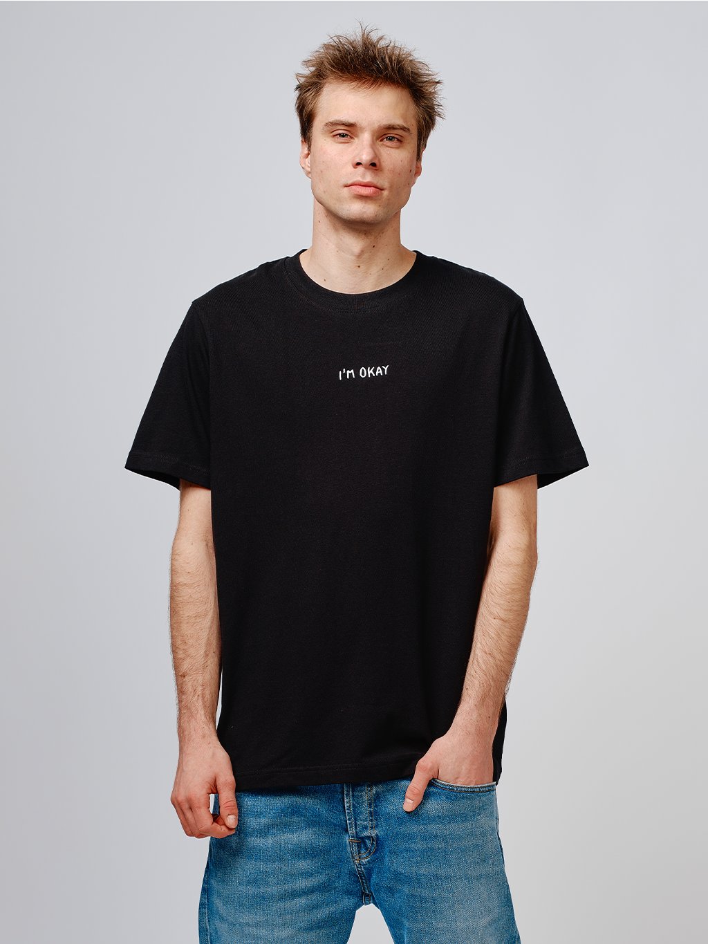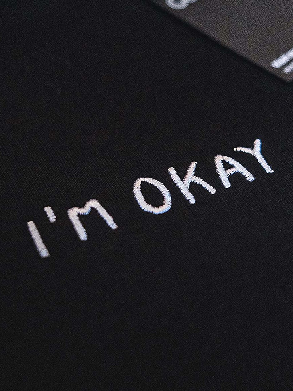 The I'm OKAY claim is embroidered on the chest. The main illustration is screen printed.