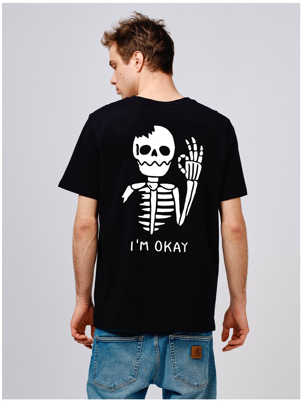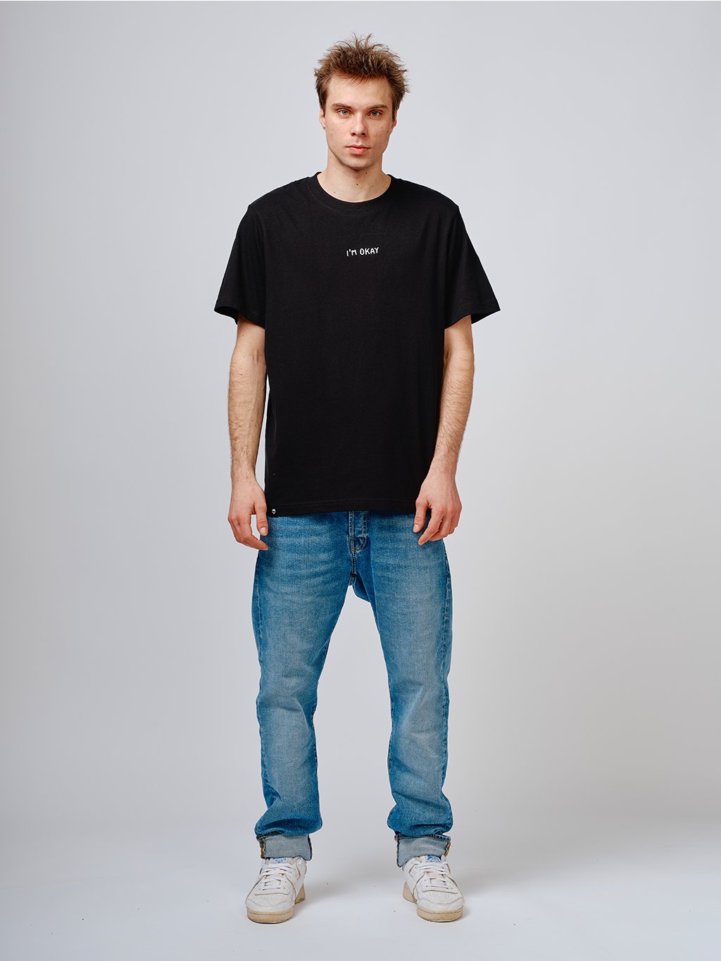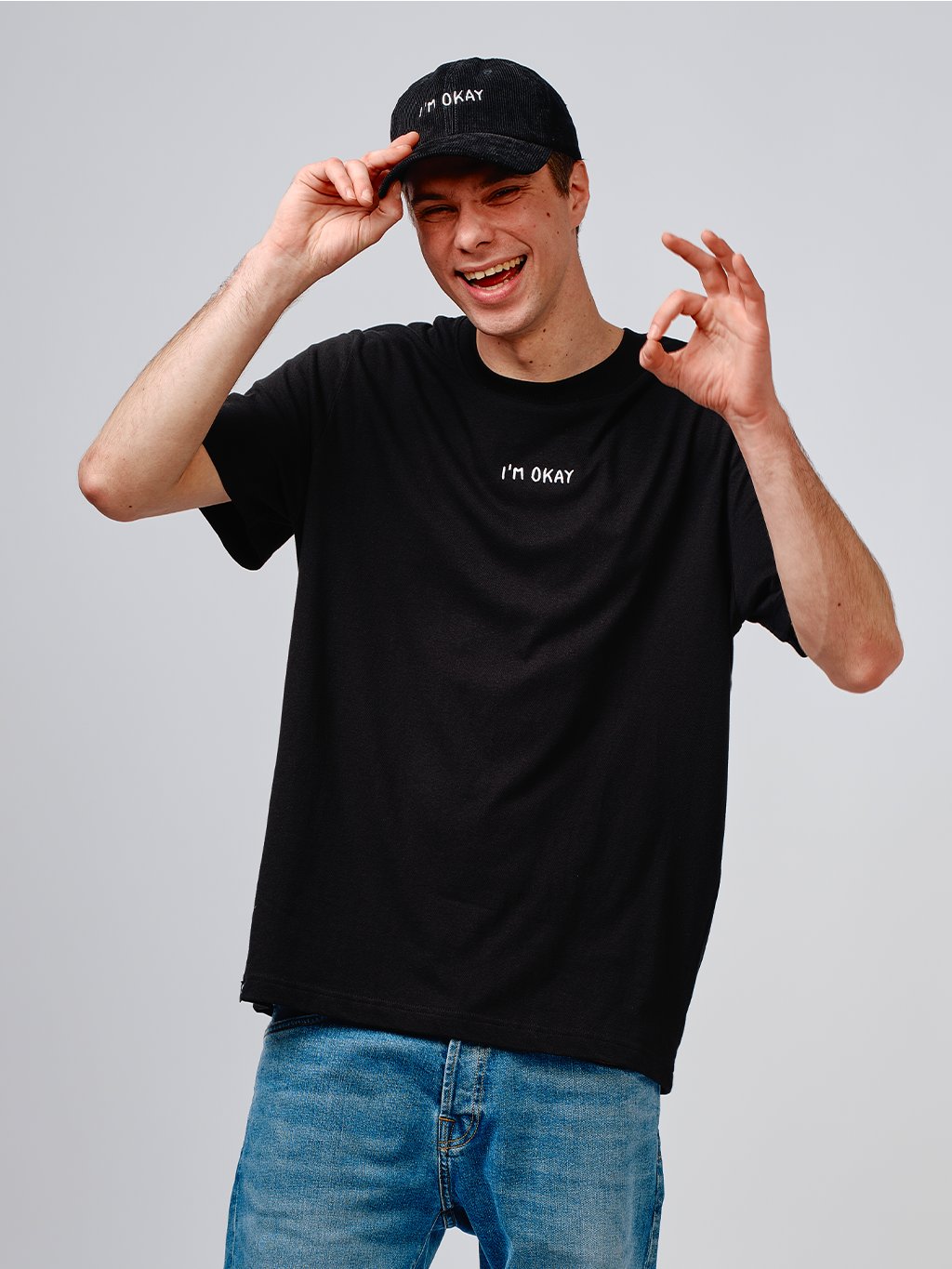 The I'm OKAY claim is embroidered on the chest. The main illustration is screen printed.