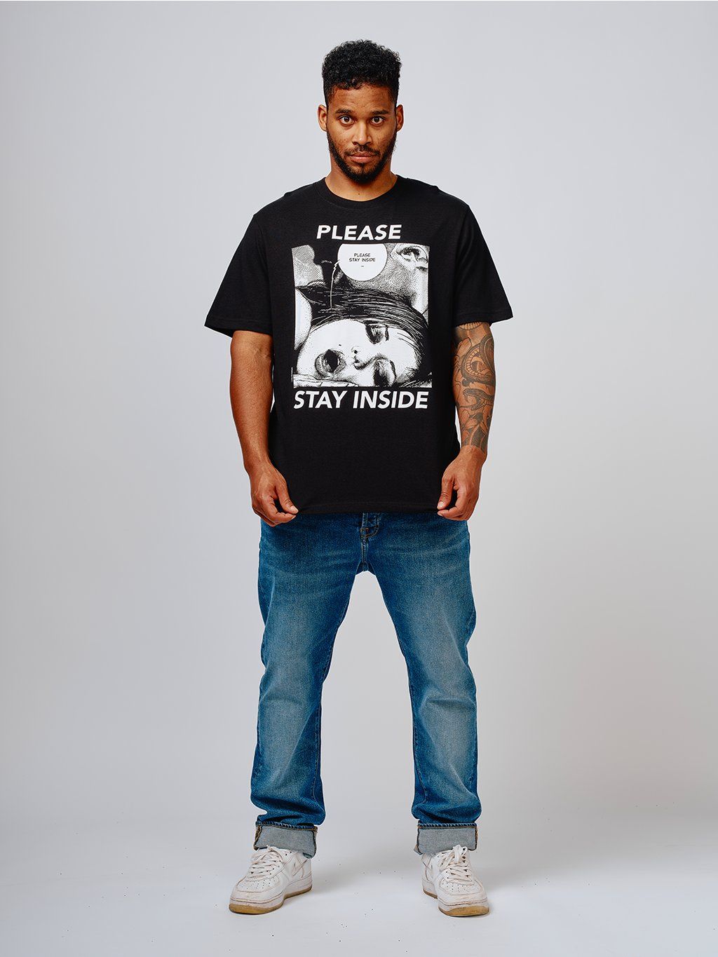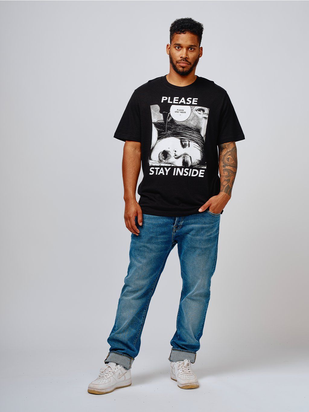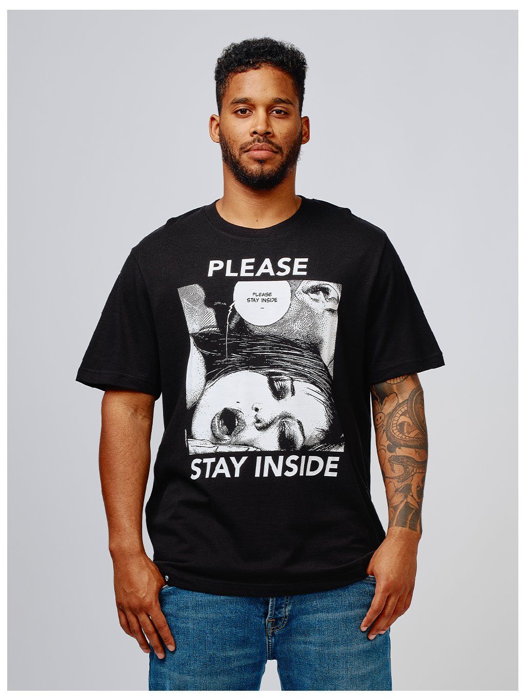 Black T-shirt with Stay Inside motif by Swiss illustrator Apollonie Saintclair.