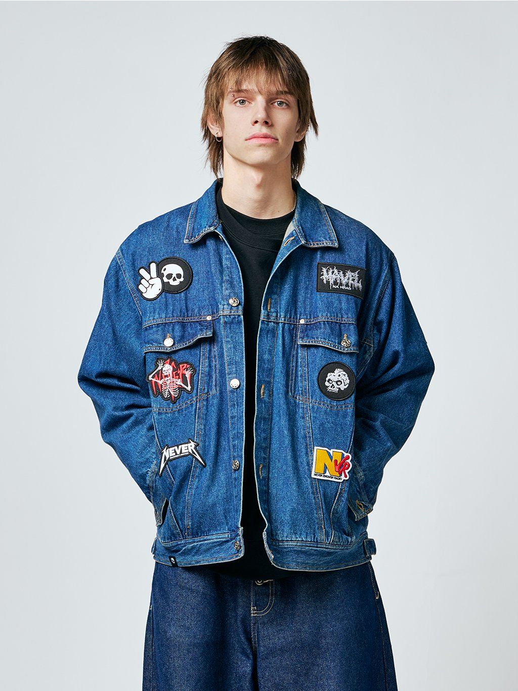 Upcyklovaná džínová bunda s nášivkami Never Enough