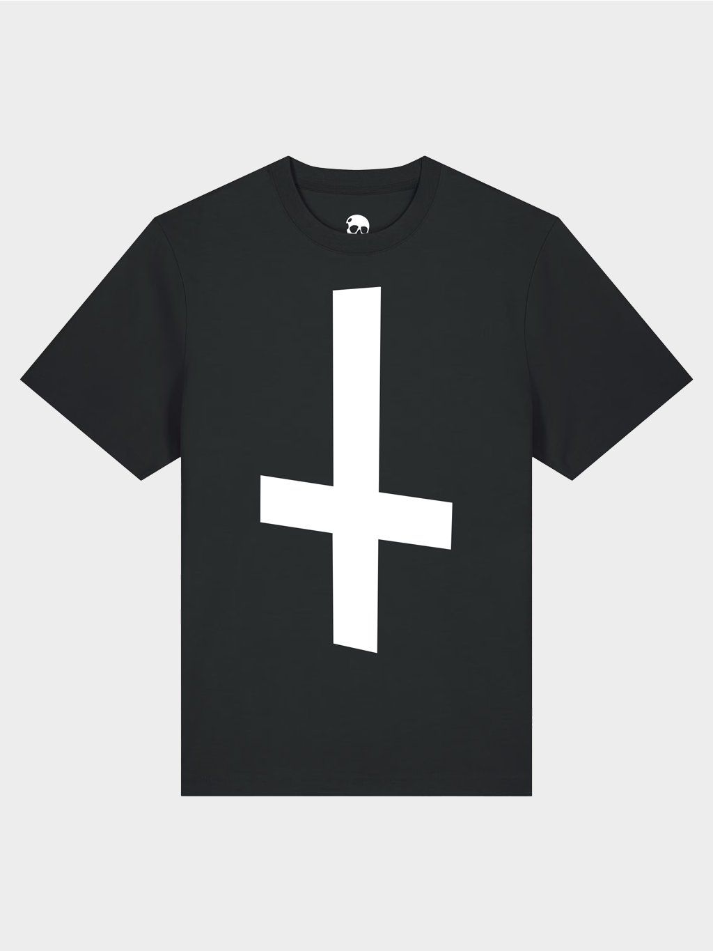 Klasické černé unisex tričko ze 100% organické bavlny s motivem obráceného kříže, který jsme sundali z kostela Nejsvětějšího Srdce Páně.