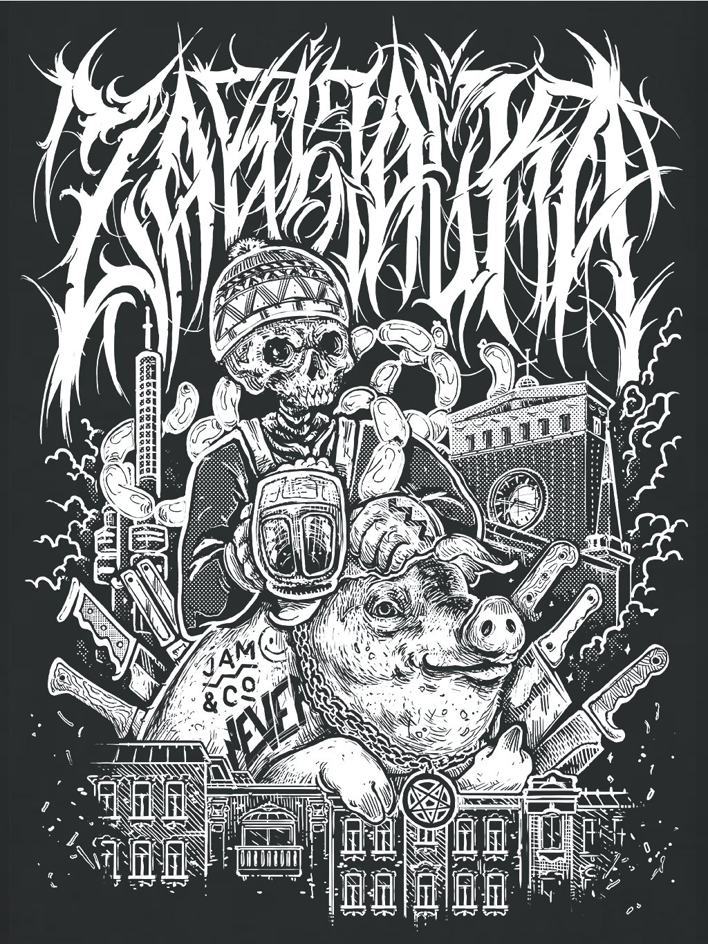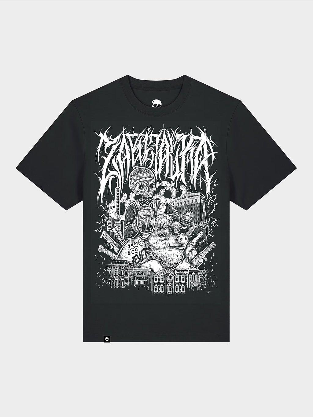 Klasické černé unisex tričko ze 100% organické bavlny s motivem Zabijačka II od ilustrátora Artioma Pituscana. Triko bylo vyrobeno jako merch v kolaboraci s vršovickou restaurací Jam&Co. v rámci akce "Tradiční zabijačka na Vinohradech".