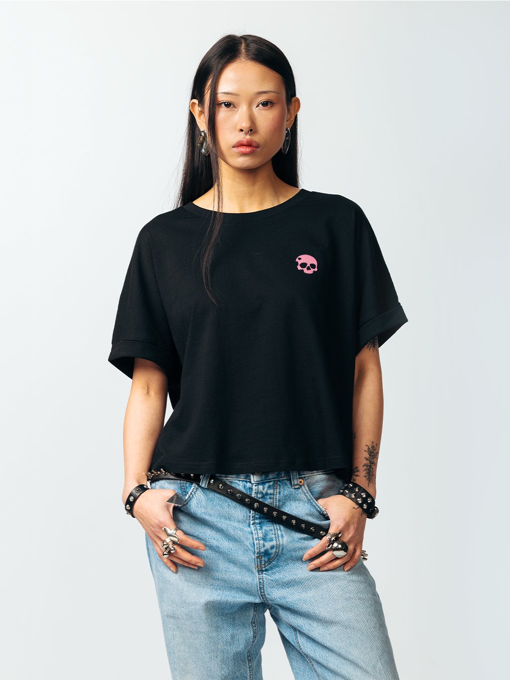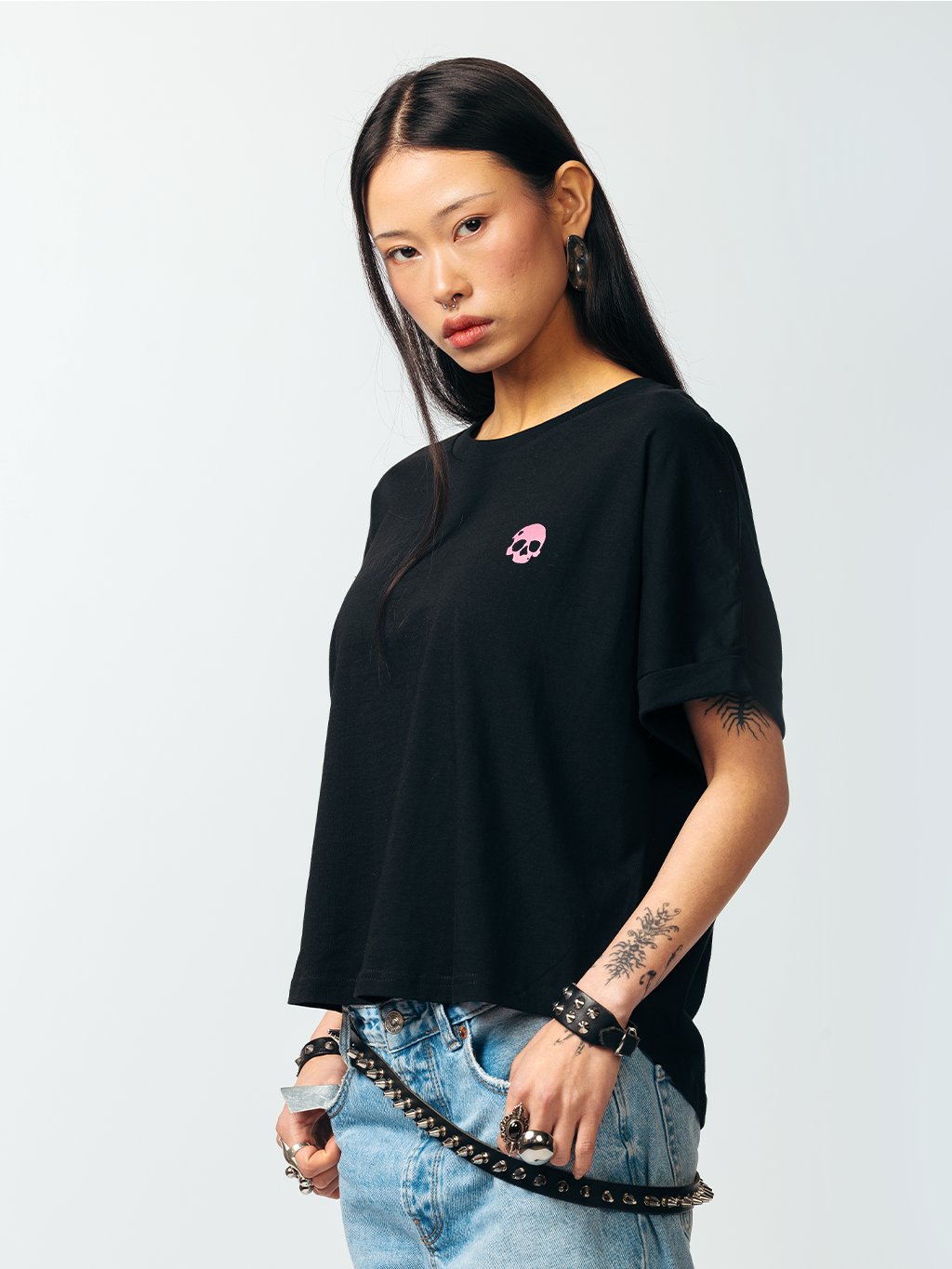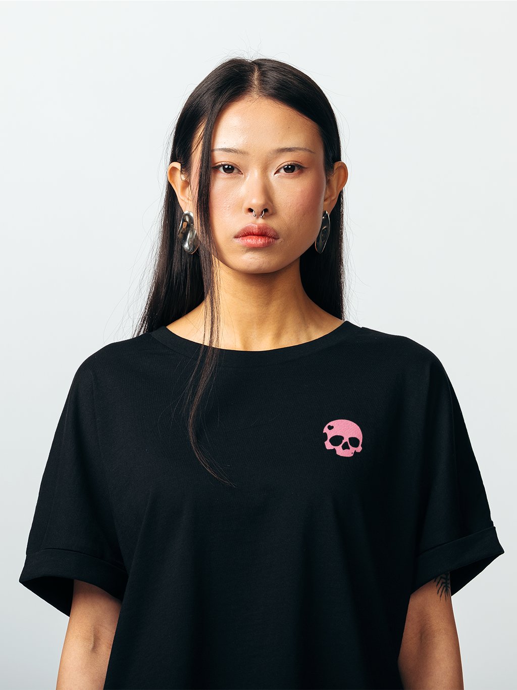 Kvalitní dámské oversized tričko s bezešvým rukávem typu dolman. Příjemný organický bavlněný materiál, zaoblený spodní lem a prodloužená zadní část. Opatřeno malým logem Never Enough ve variantě Heart Skull.