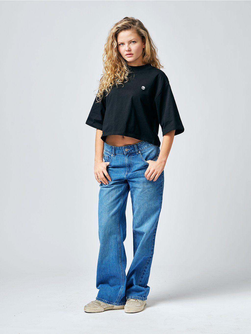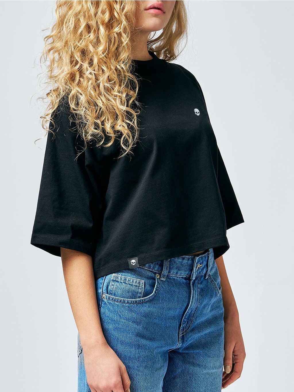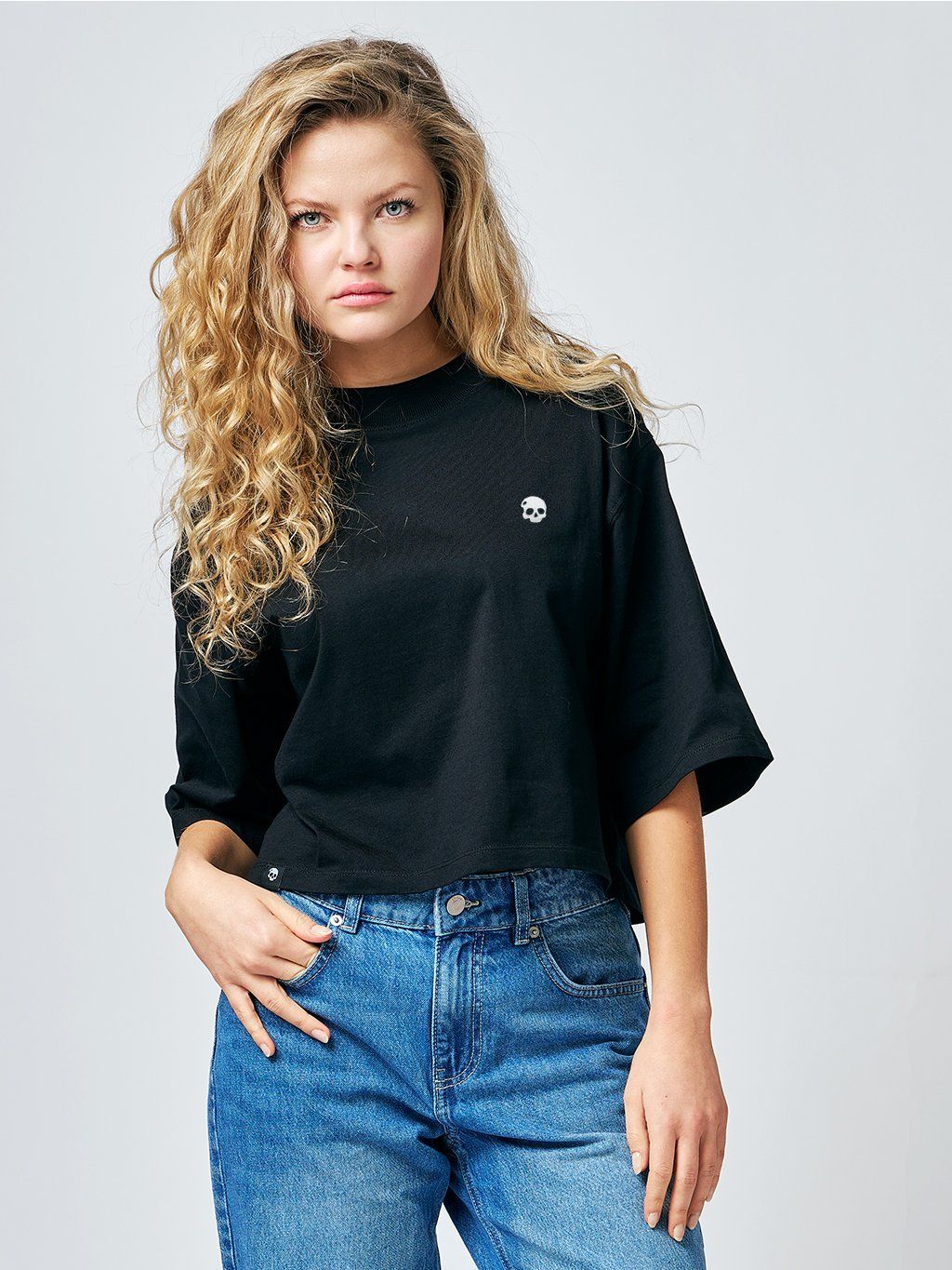 Černé dámské tričko — hodně relaxed střih z kombinace recyklované a organické bavlny s bílou výšivkou ikony NVR na hrudi.
